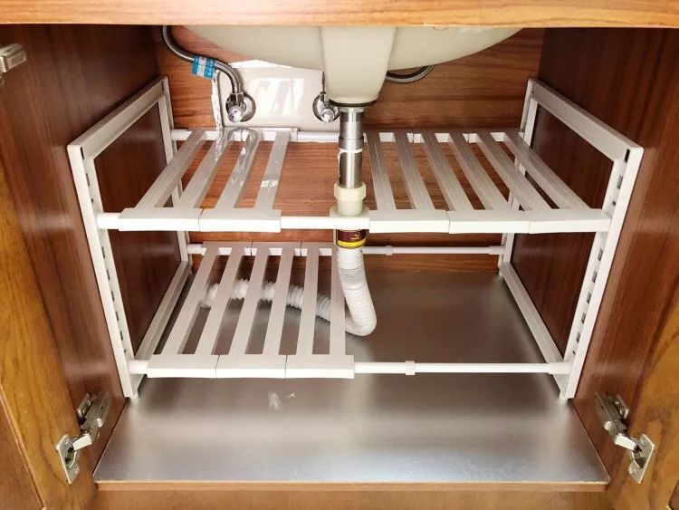 这里的空间因为结构异形,进而被很多人忽视浪费,其实摆放一款可调节的置物架,用来收纳厨房清洁用品以及其它东西正好!
