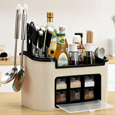 前面说到过挂杆挂钩,但利用相应的置物架,也可以把刀具、餐具以及各种调味料通通归类收纳!