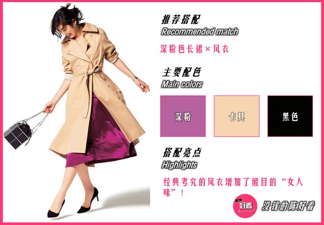 穿着考究的风衣增加了醒目的女性气质!添加了一条明亮的深粉红色裙子作为配色方案,以打造出外出时都可以信赖的华丽服装。
