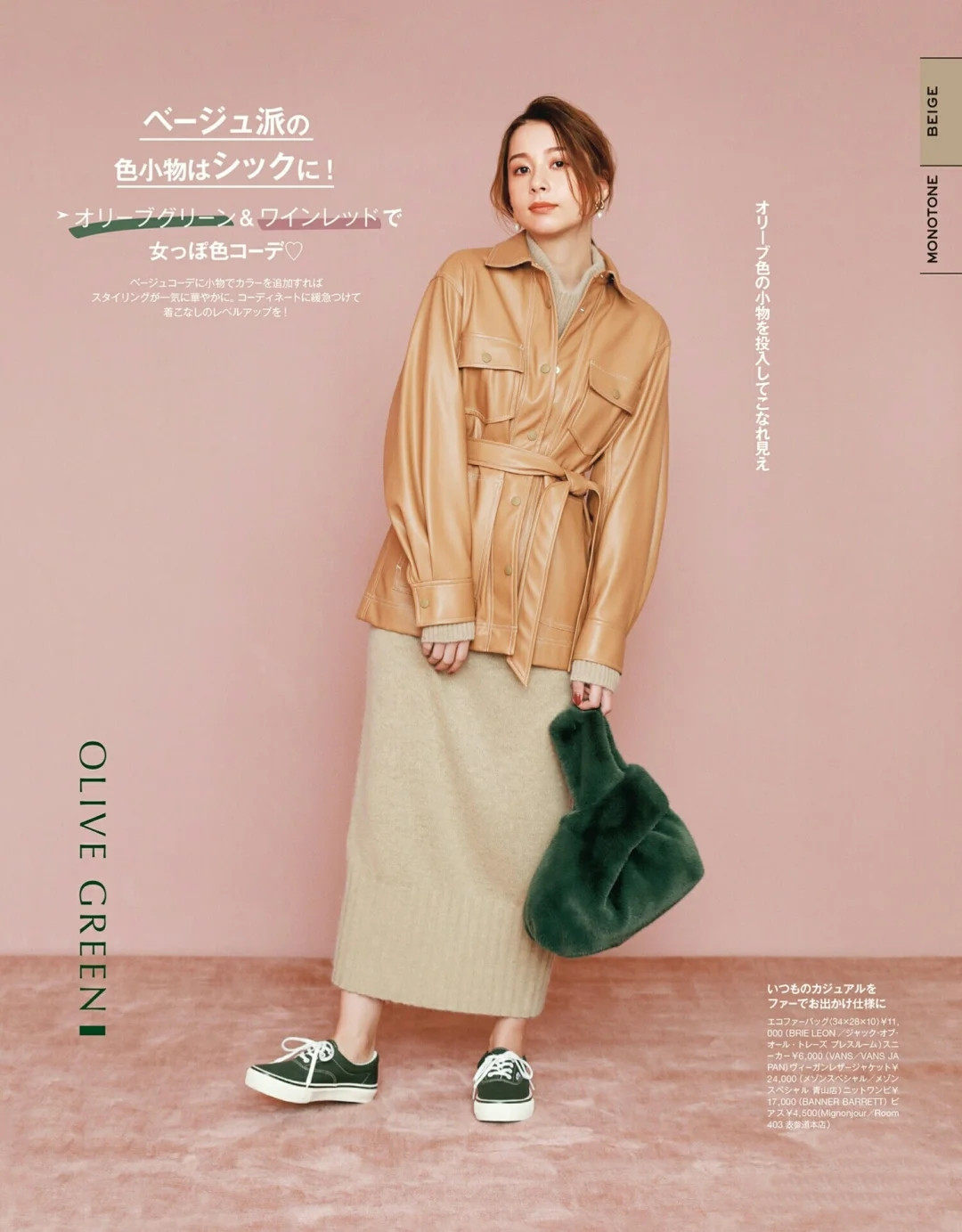 腰间的腰带设计很好的凸显出了腰身,就像是自己打造了一个腰线一样,让身体看起来就像是三七分一样,显得腿很长。脚上搭配的绿色休闲帆布鞋很自然,我们也可以换成绿色的高跟鞋显得庄重又成熟。整身的亮点就是手上的墨绿色毛绒包包,可爱又温暖。